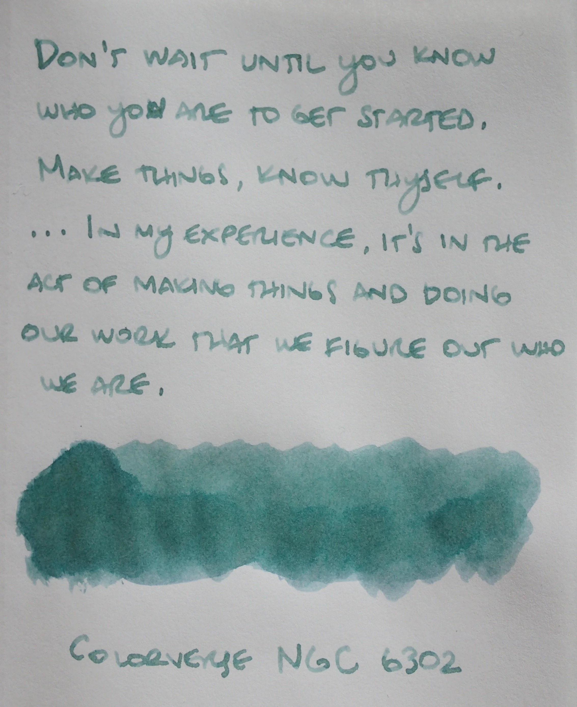 I admit I don’t have a lot of experience with this ink. It came in a mini-bottle accompanying the large bottle of Colorverse Butterfly Nebula I bought. At the time I got the set, I virtually ignored NGC 6302 because I was more into shimmer inks and this seemed boring. But recently as I mined my ink collection for dusky inks, I realized this one fit the bill. It’s more green in real life, perhaps more like a sea green with blue undertones? I tried to color correct for more accuracy.