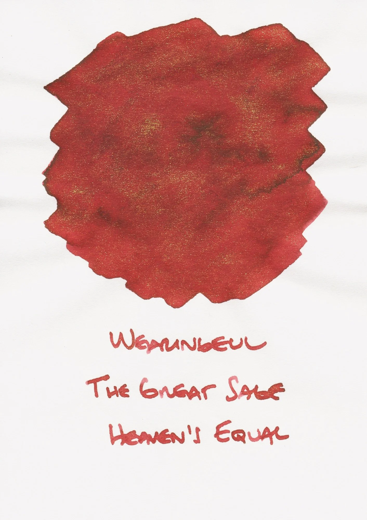 And finally, Wearingeul’s The Great Sage Heaven’s Equal ink has a dark burgundy color, but it’s a bit brighter and more red-leaning than Bah Humbug, and has gold shimmer. But it’s an interesting adjacent ink.