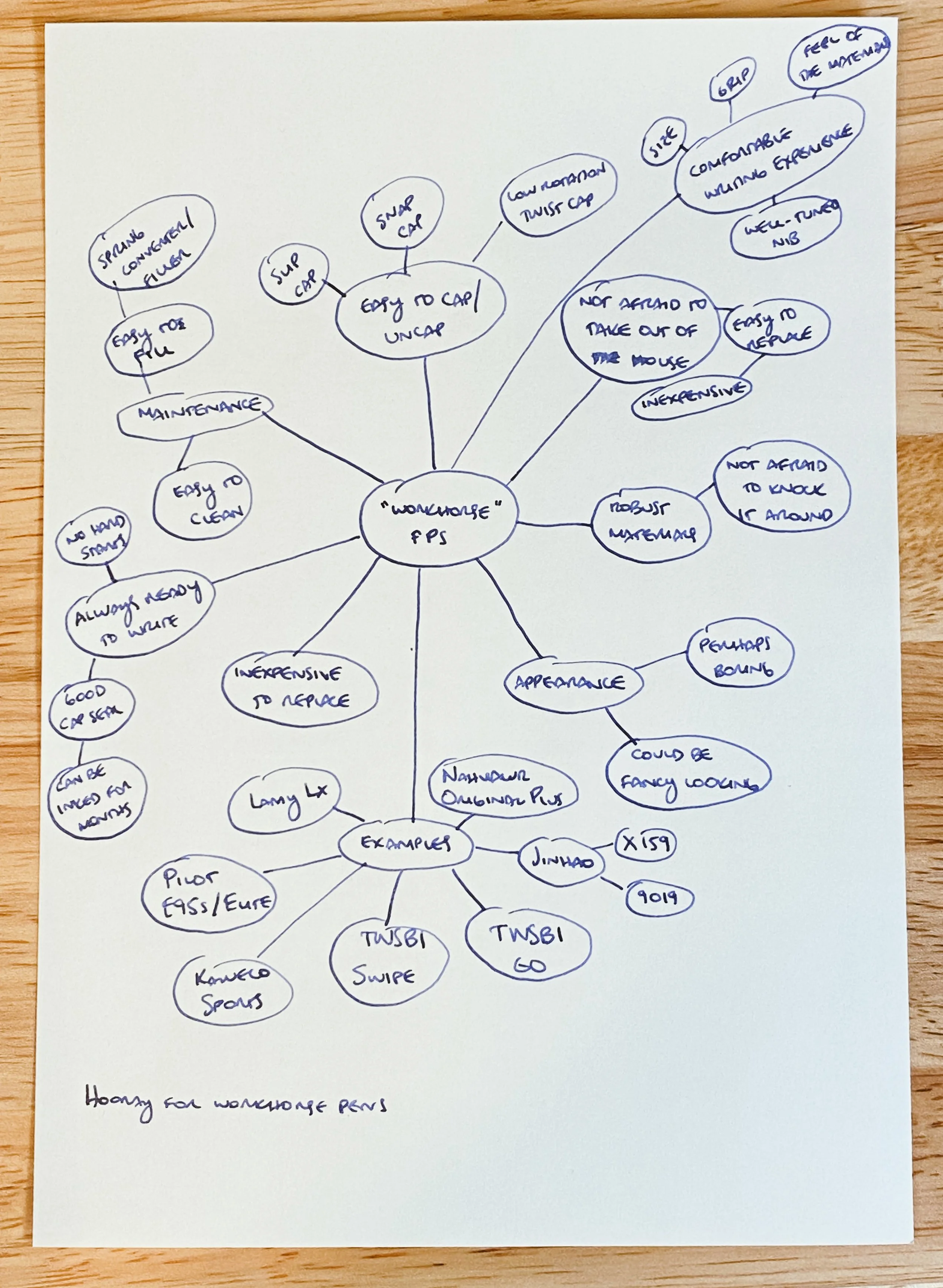 Here’s a sneak peek at a mind map I jotted down when I was thinking about what a “workhorse pen” means to me, fairly free-flowing with a couple redundant bubbles and sometimes a lack of consistent categorization. 🤷♀️