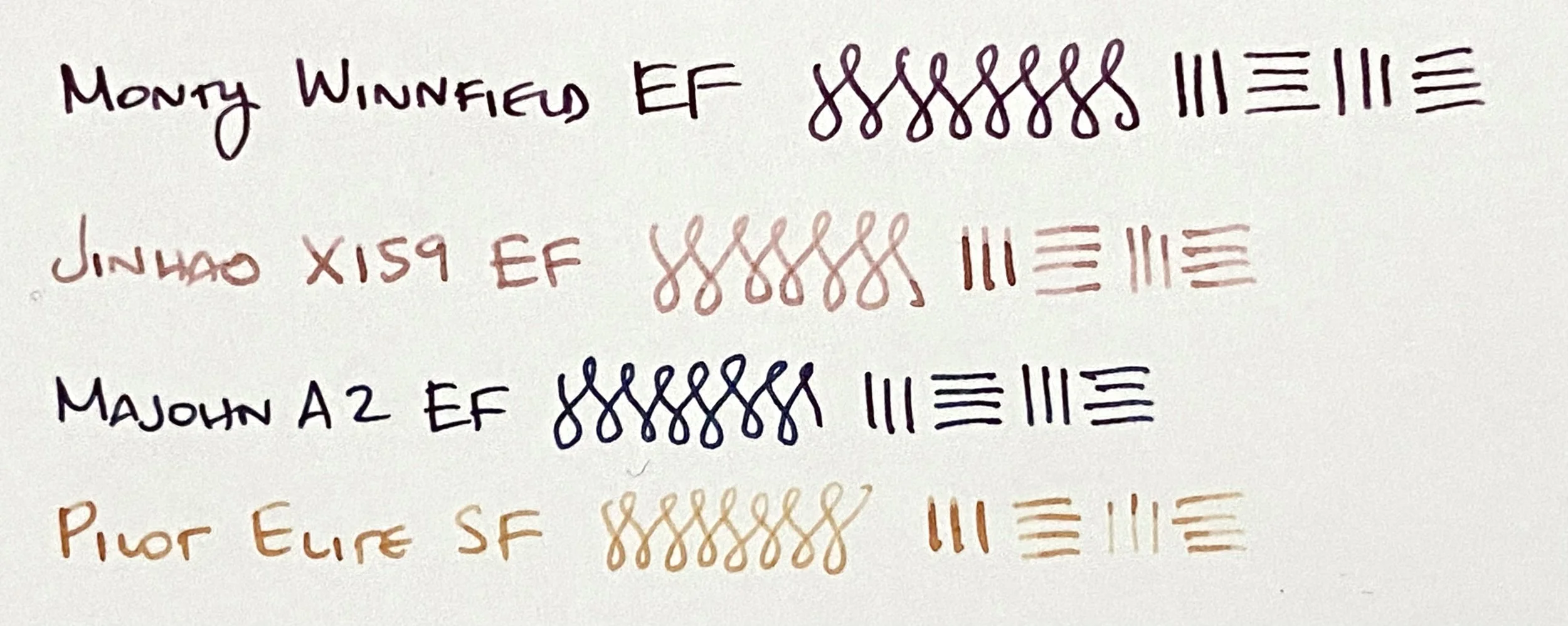 Below is a comparison with other extra-fine nibs (and one Japanese fine nib) that I have. You can see the ever-so-slightly italic look of the Utility nib compared to the regular EFs. And at the bottom is the Pilot soft-fine nib which is comparable to the other EFs.