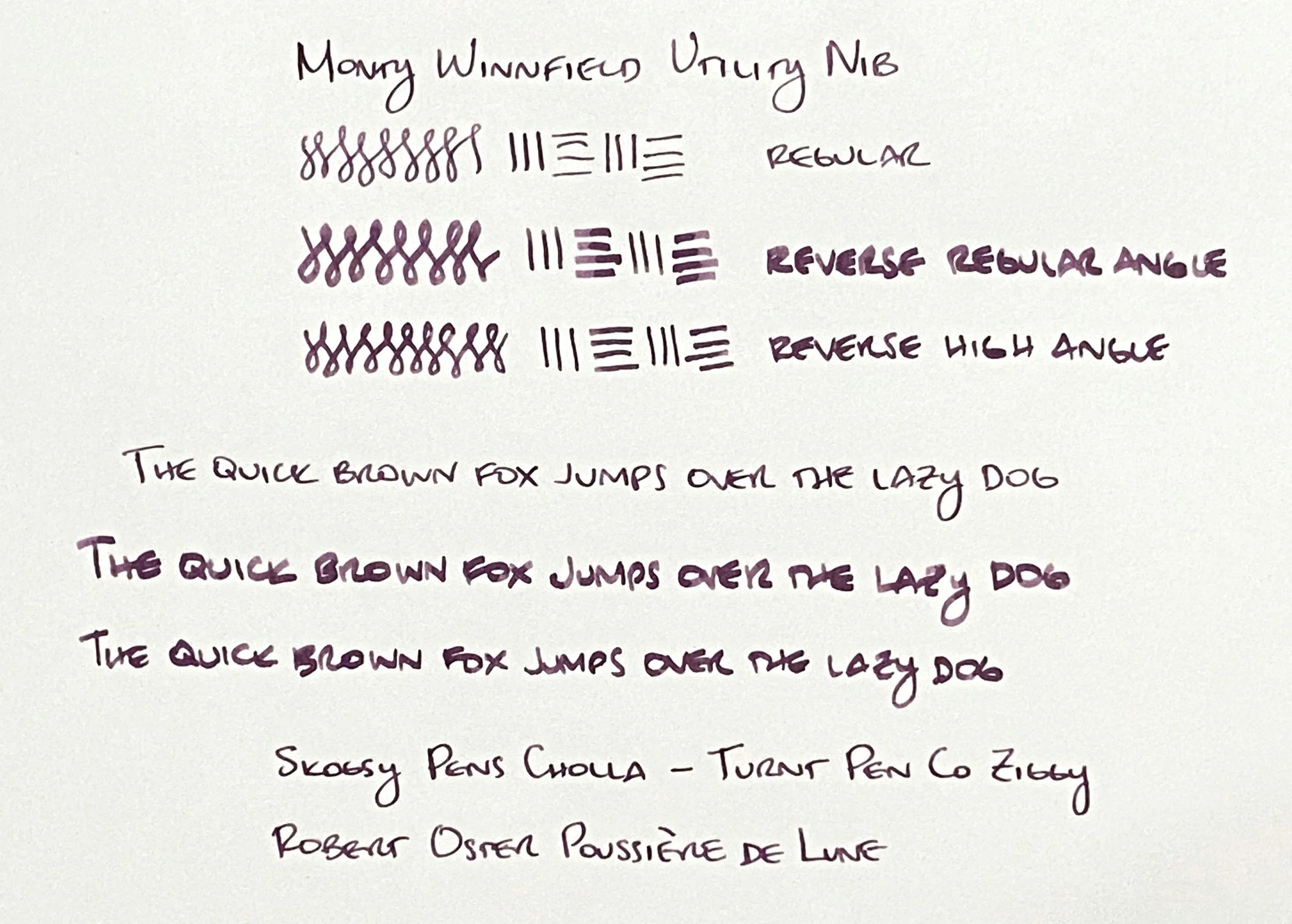 I think this nib grind would be considered a reverse broad architect. I have a broad architect grind from someone on r/Pen_Swap, and it writes similarly to this but flipped, with the broad architect on the normal side and italic extra-fine line on the reverse. I think the Utility nib has a more usable configuration for my small handwriting.